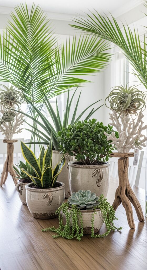 Consider snake plants, aloe vera, or jade plants in weathered ceramic pots. Incorporate driftwood accents for organic appeal by using pieces as plant stands or wall-mounted planters. Palm fronds in tall vases create instant tropical vibes, while air plants displayed on coral branches bring effortless coastal charm to your space.