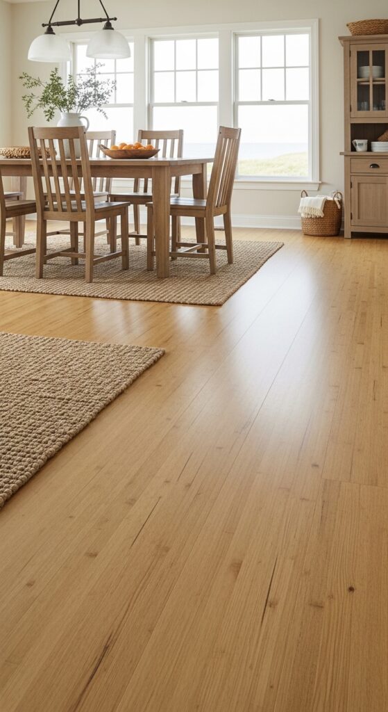 Consider wide-plank hardwood in weathered oak or pine finishes that create driftwood inspired surfaces throughout your space. Light bamboo flooring offers sustainable appeal with natural grain patterns resembling sun-bleached wood. For budget-friendly options, choose luxury vinyl planks in whitewashed or gray-washed tones.