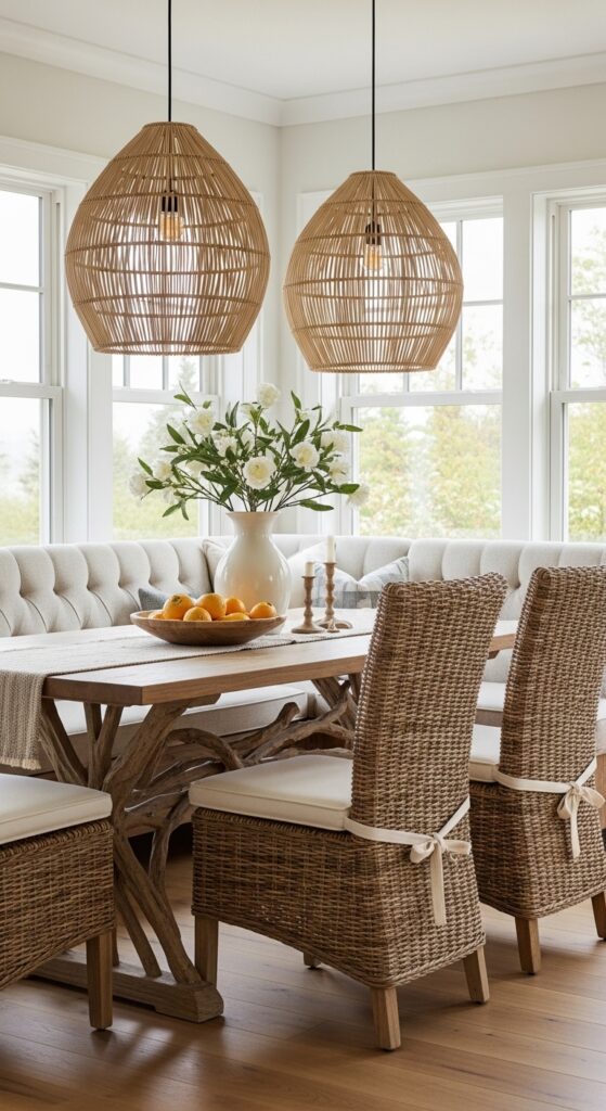 Mix different weave patterns and finishes to add depth without overwhelming your airy aesthetic. Consider adding banquette seating in corner areas to maximize your dining space while maintaining the relaxed coastal vibe.