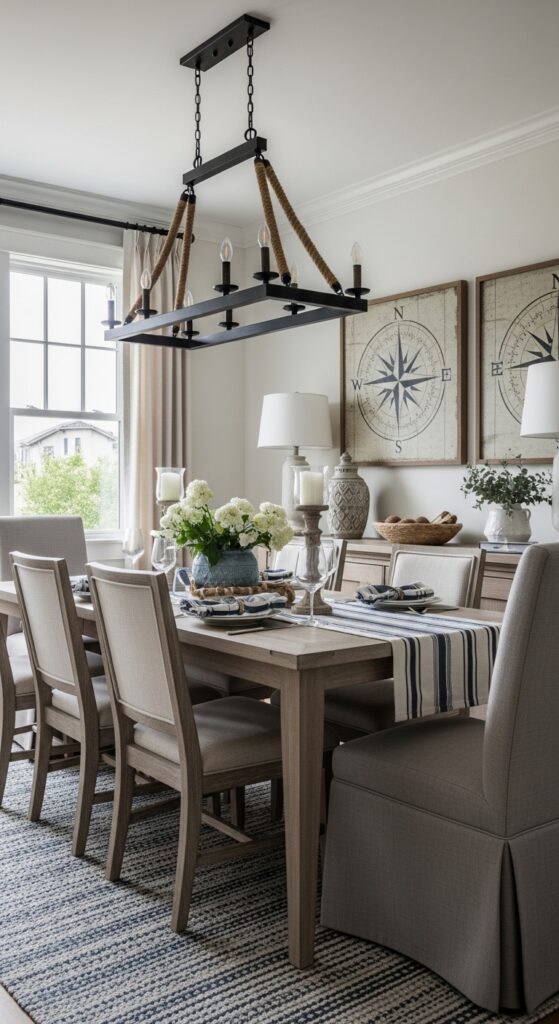 Strategic nautical accents alter your dining room into a coastal retreat while maintaining sophisticated elegance that won’t feel like a theme restaurant. Choose one statement piece like a ship’s rope chandelier or vintage compass wall art rather than cluttering surfaces with anchors and seashells. Balanced coastal accents work best when you select items with clean lines and neutral colors.