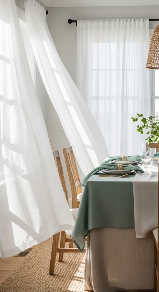 Flowing fabrics bring that gentle coastal movement indoors, creating the visual sensation of ocean breezes throughout your dining space. Flowing sheer curtains catch natural light while allowing soft movement that mimics wind patterns along the shoreline. Choose lightweight materials like cotton voile or linen blends that dance with air currents from windows or ceiling fans.