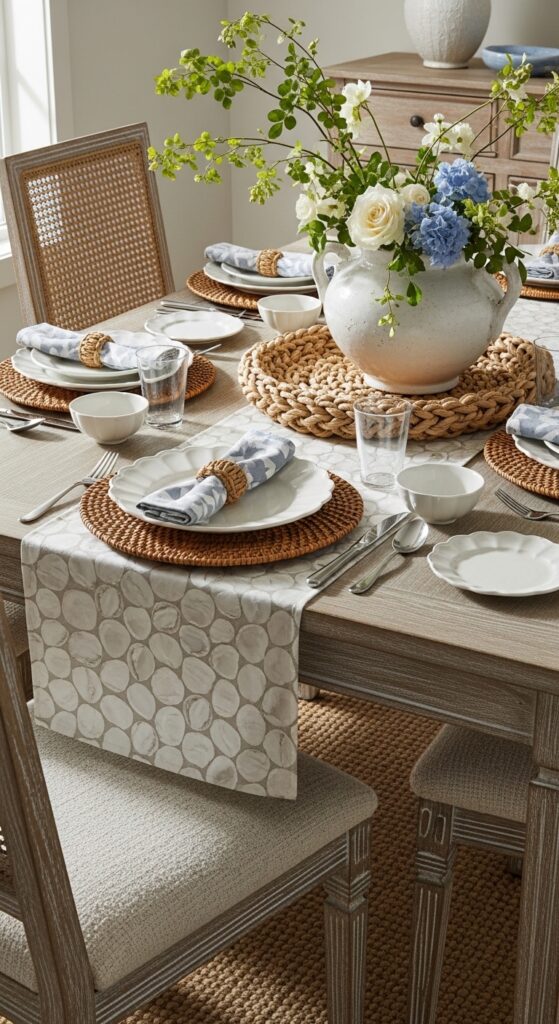 Layer sisal rugs beneath your dining table to replicate sandy beaches underfoot. Highlight textured woven accents with chunky rope placemats or rattan chargers that bring natural coastal elements indoors. Mix smooth ceramic dishes with rough burlap cushions to create visual contrast. These layered textures submerge your dining space into an authentic seaside retreat that feels both relaxed and sophisticated.