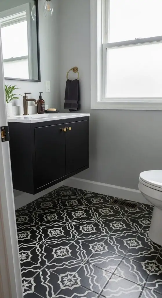 Geometric patterns and intricate designs convert your half bathroom floor into an artistic magnum opus when you choose cement tiles in deep black hues. You’ll uncover textured black cement tiles offer durability alongside stunning visual impact, creating focal points that demand attention.
