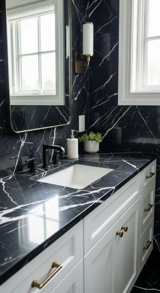 Pair these dark surfaces with white or cream cabinetry to prevent overwhelming the space. Add warm brass fixtures to complement the marble’s natural veining patterns beautifully.