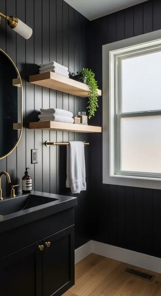 Consider a staggered shiplap pattern for added dimension that breaks away from conventional designs. The grooves and shadows naturally created by shiplap boards add depth to your black paint choice, preventing the color from appearing flat or overwhelming in your intimate powder room space. This approach incorporates the same wood accents that make farmhouse designs so inviting while maintaining your bold, modern aesthetic.