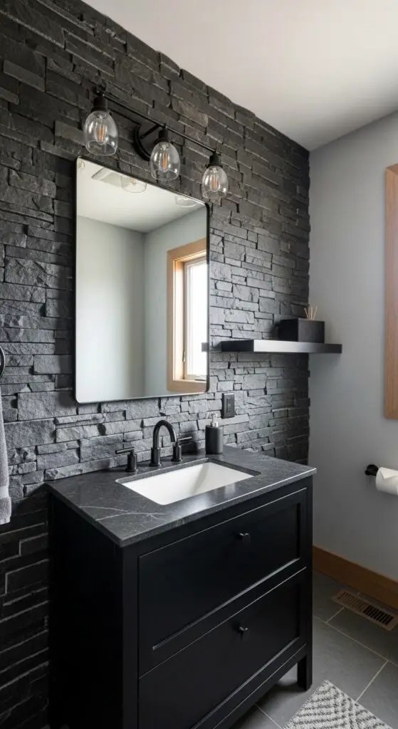 When you’re seeking dramatic impact in your half bathroom, black stone accent walls deliver unmatched visual depth through their naturally occurring textures and rich mineral variations. These natural stone patterns create stunning focal points that alter compact spaces into luxurious retreats.