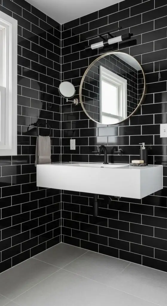 Black subway tiles with white grout create one of the most timeless and visually impactful wall treatments you can choose for your half bathroom. The stark contrast between dark tiles and bright grout lines produces a graphic, sophisticated look that’s both classic and contemporary.