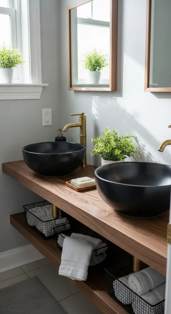 Elegance meets functionality when you pair sleek black vessel sinks with minimalist floating shelves to create a stunning focal point in your half bathroom. This creative sink placement maximizes floor space while providing modern sophistication that breaks traditional design rules.