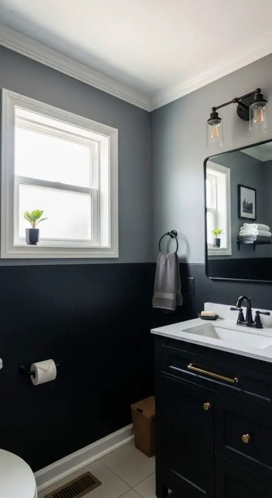 Moving beyond single-color schemes, charcoal gray and black two-tone walls create sophisticated depth that alters your half bathroom into a designer showcase. You’ll achieve maximum impact by painting the lower half black while keeping upper walls charcoal gray. This strategic color placement grounds the space without overwhelming it.