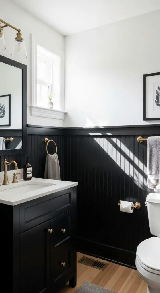 Traditional beadboard wainscoting takes on bold sophistication when painted in rich black tones that alter your half bathroom’s lower walls. You’ll create dramatic visual interest while maintaining the classic charm that makes beadboard timeless. Textured black beadboard adds depth and character, reshaping ordinary walls into striking focal points that guests won’t forget.