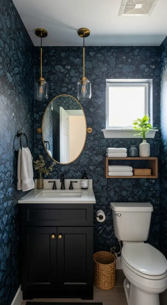 Metamorphose your half bathroom into a sophisticated retreat by choosing dark moody wallpaper that creates an intimate, luxurious atmosphere. You’ll achieve stunning results with bold color patterns featuring deep navy florals, charcoal geometric designs, or rich emerald botanical prints that command attention without overwhelming the compact space.