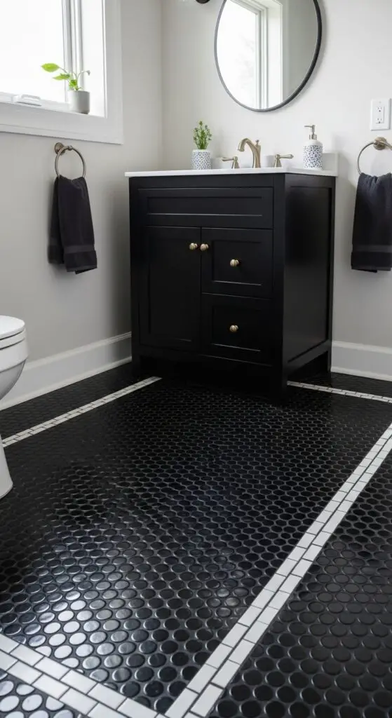 Glossy Black Penny Tile Floors
