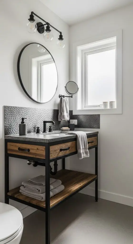 Raw steel frames paired with reclaimed wood surfaces deliver an unmistakably bold aesthetic that transforms your half bathroom into a modern industrial sanctuary. You’ll find that hammered metal vanity options create stunning focal points with their textured surfaces and robust construction. The weathered patina adds character while providing durability that withstands daily use.