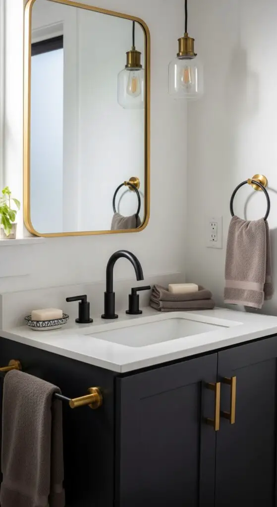 Choose cabinet pulls and drawer handles in warm brass tones to complement your vanity’s dark surface. The matte black hardware finishes create depth without overwhelming your compact bathroom layout. Add complementary gold accents through mirror frames, light fixtures, or decorative accessories to tie the entire look together seamlessly and create a cohesive, luxurious atmosphere. The sleek fixtures and contemporary finishes enhance the overall modern aesthetic of your half bathroom design.
