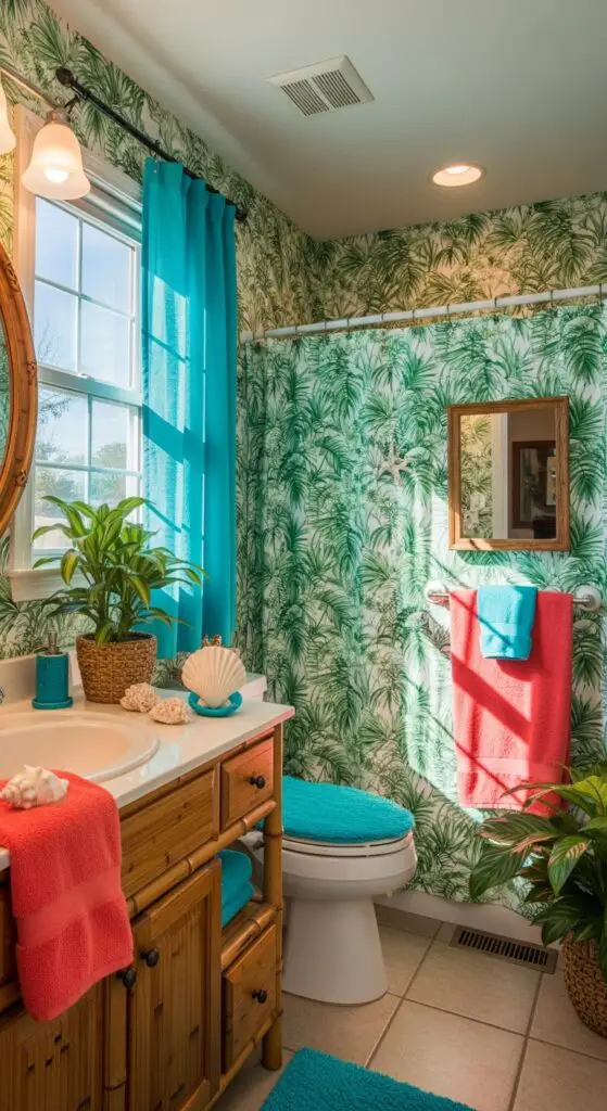Palm leaf accents work beautifully as wall decorations or shower curtain patterns, creating natural focal points throughout the room. Consider incorporating inspiring wallpaper designs with tropical motifs to add even more personality and visual interest to your space. Install a tropical inspired vanity with bamboo-style textures or warm wood finishes to anchor the design. Add bright coral towels, seashell accessories, and potted plants to complete your guests’ escape to their personal tropical oasis.