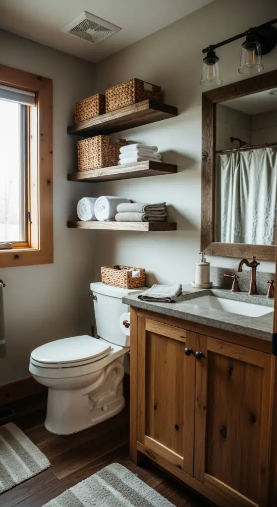 Add reclaimed wood shelving above the toilet for towel storage while maintaining that cozy cabin feel. Natural lighting works perfectly with warm textures like woven baskets and linen towels. Choose earthy color palettes—deep browns, cream whites, and sage greens complement wood beautifully. Consider a vanity design that maximizes both storage capacity and visual appeal for your guests. Finish with copper fixtures and mason jar accessories to complete your rustic metamorphosis.