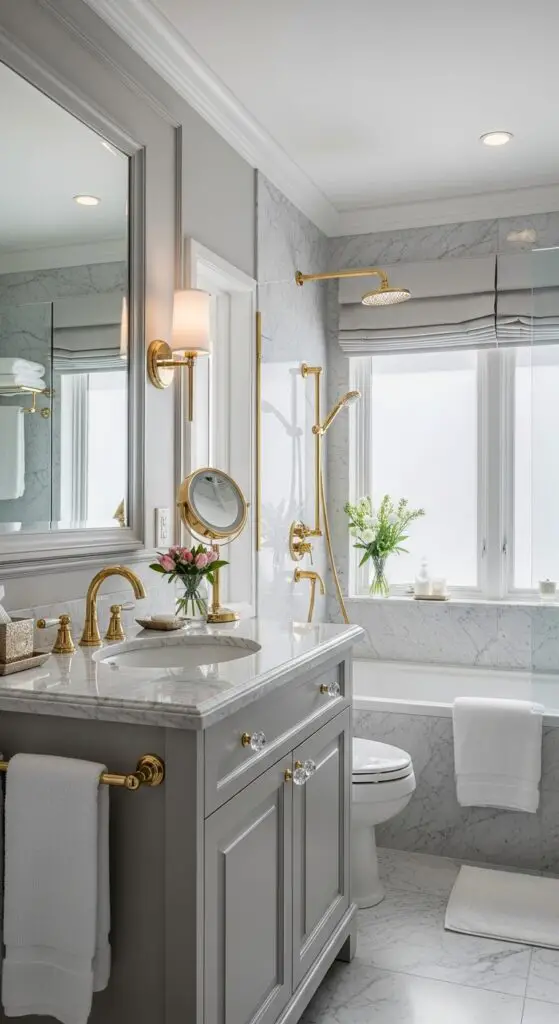 Add plush towels, ambient lighting, and decorative mirrors with ornate frames. Consider installing a rainfall showerhead and placing fresh flowers or high-end toiletries as finishing touches that’ll make your guests feel pampered and valued. Choose grey color schemes to create a calm and modern atmosphere that exudes elegance throughout the space.