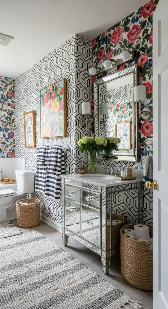 Mix geometric wallpapers with striped towels and floral artwork to create vibrant visual interest throughout your space. Don’t hesitate to combine different scales—pair large botanical prints with smaller polka dots for engaging contrast. A mirrored vanity amplifies patterns while adding glamorous sparkle to your maximalist design.