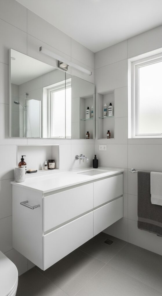 How can you alter a cramped guest bathroom into a sleek, functional retreat that feels twice its actual size? Start with a minimalist vanity design featuring clean lines and wall-mounted fixtures that create visual breathing room.