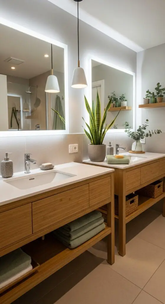 Calming lighting features become essential—install soft LED strips behind mirrors or add dimmable pendant lights for adjustable ambiance. Choose a neutral color palette with soft beiges, whites, and sage greens. Add plants like snake plants or eucalyptus for natural air purification.
