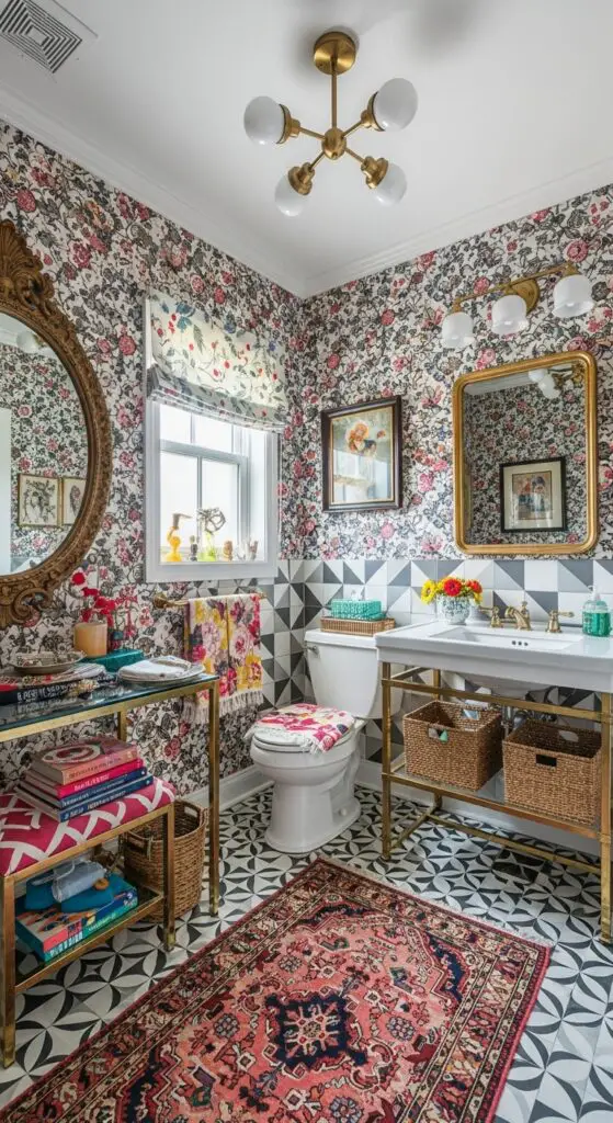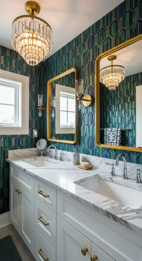 Choose bold wallpaper featuring chevron, sunburst, or hexagonal patterns in deep jewel tones like emerald or sapphire. Add metallic accents through gold-framed mirrors, brass cabinet hardware, and chrome faucets that catch and reflect light beautifully. Select marble countertops with distinctive veining to enhance the luxurious aesthetic.