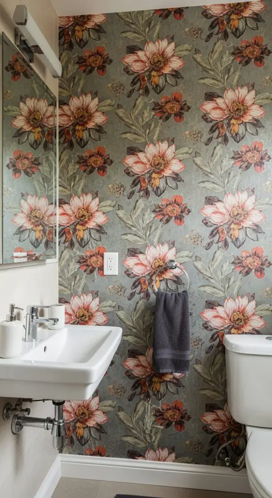 Textured statement wallpaper adds dimensional depth through raised surfaces, metallic finishes, or fabric-like materials. Install wallpaper behind your toilet or sink area, keeping remaining walls neutral for balance. Consider geometric patterns, grasscloth textures, or embossed designs that catch light beautifully. You’ll create sophisticated contrast while maintaining functionality in your compact space.