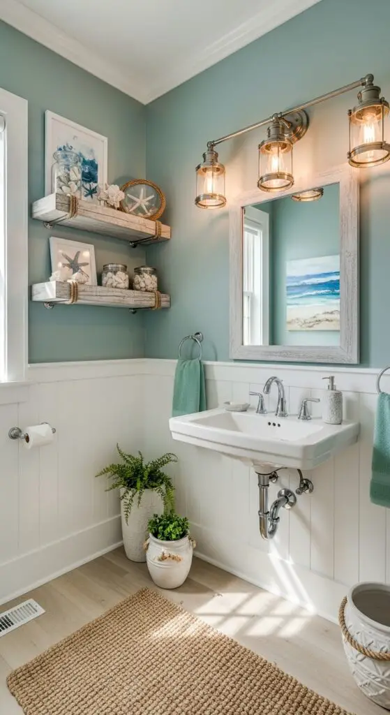 Add seashell decor through decorative bowls filled with collected shells or wall-mounted displays. Install weathered wood shelving and rope-textured accessories to enhance the maritime atmosphere. Choose light fixtures that mimic driftwood or nautical lanterns.