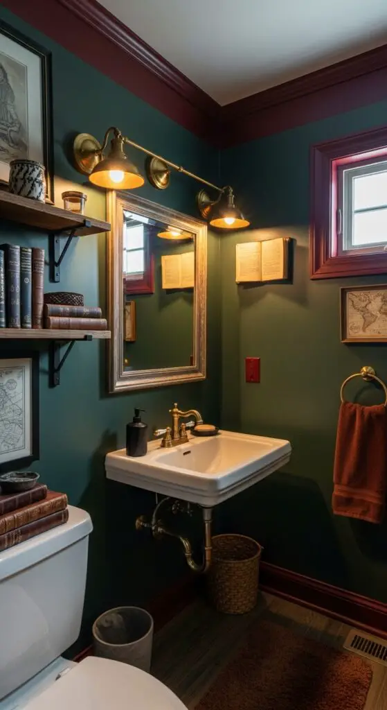 Alter your Bloxburg half bathroom into a sophisticated scholarly retreat by embracing rich, moody colors and timeless vintage elements that evoke the atmosphere of an old university library. Deep forest greens, burgundy, or charcoal walls create the perfect backdrop for your academic sanctuary.