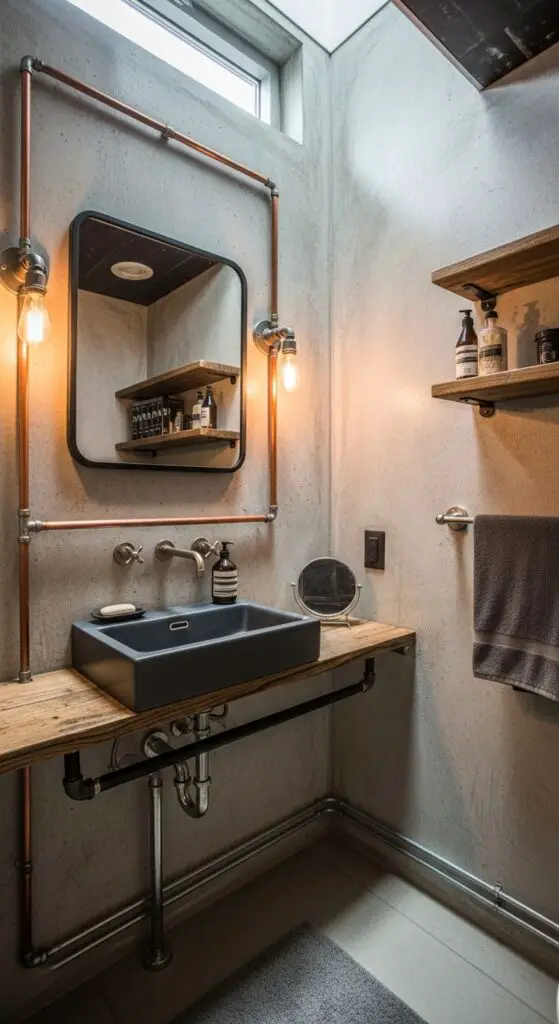 Install black iron fixtures and copper pipes that showcase their utilitarian purpose rather than hiding them. Metallic hardware accents in brushed steel or matte black complete the look perfectly. Add Edison bulb lighting fixtures and reclaimed wood shelving to soften the hardness.