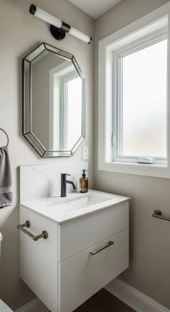 Add a single statement mirror with geometric edges and incorporate hidden storage solutions. Consider contemporary finishes like brushed metal or matte black for your fixtures to elevate the sophisticated aesthetic. This approach gives you complete design freedom while creating a sophisticated retreat that feels larger than its actual footprint.