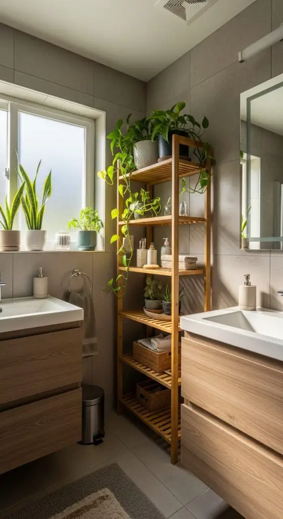 Second, choose natural textures through bamboo accessories, stone-look tiles, or wood-grain vanities that create authentic outdoor vibes.