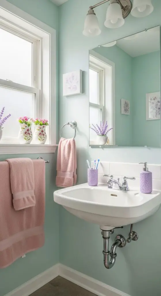 Paint walls in soft sage while adding complementary accessories in coordinating hues. Incorporate floral decor accents through wallpaper borders, delicate artwork, or ceramic planters with small blooms. Choose white fixtures to maintain brightness, then layer pastel towels and soap dispensers. This aesthetic gives you creative freedom to experiment with gentle colors that promote relaxation and tranquility.