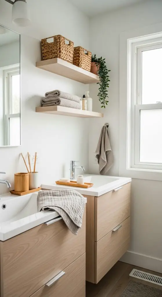 Add natural textures through woven baskets, bamboo accessories, or linen towels that bring warmth without overwhelming the space. Install floating shelves in pale wood tones to maintain clean lines while providing storage. Incorporate bright accents sparingly—perhaps a single potted plant or soft blue hand towel—to add personality while preserving the serene, uncluttered aesthetic that defines Scandinavian style.