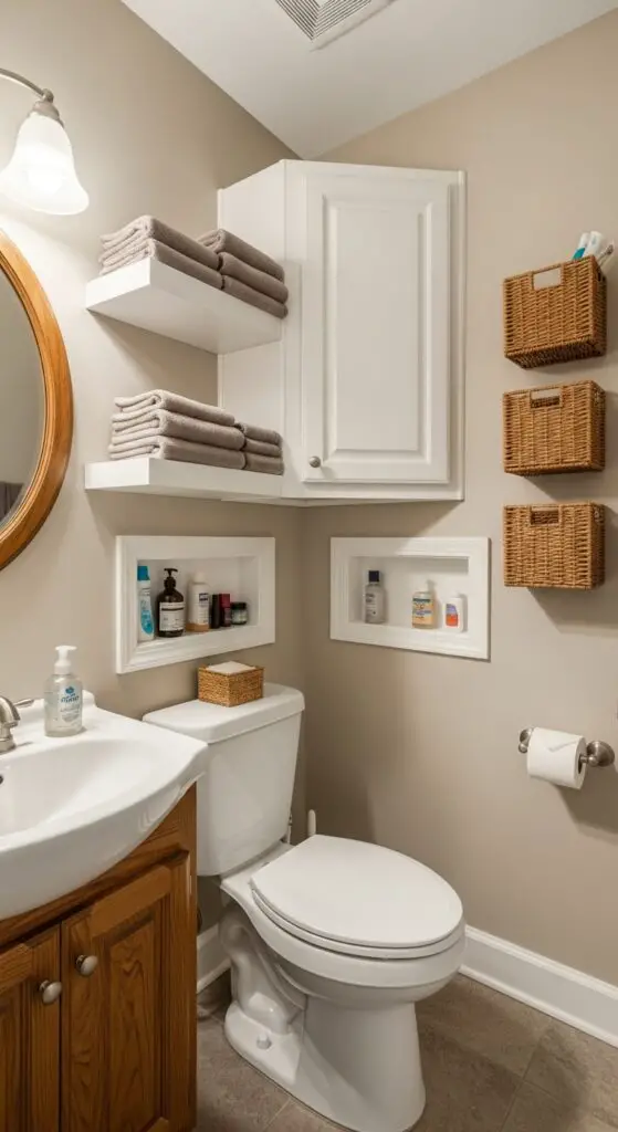 Install floating shelves above your toilet or sink area to store decorative towels and essential supplies within easy reach. Create a recessed storage niche in wall spaces between studs for sleek, built-in organization that doesn’t protrude into your walking area.