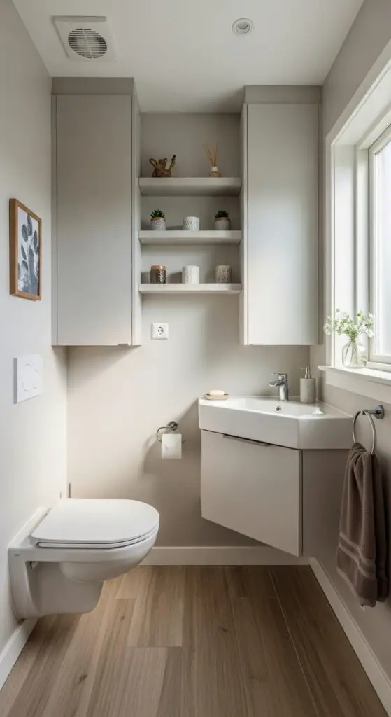 Select minimalist fixtures like wall-mounted sinks and streamlined faucets that don’t compete for attention. Keep your color palette neutral with whites, grays, or soft beiges to enhance the sense of openness.