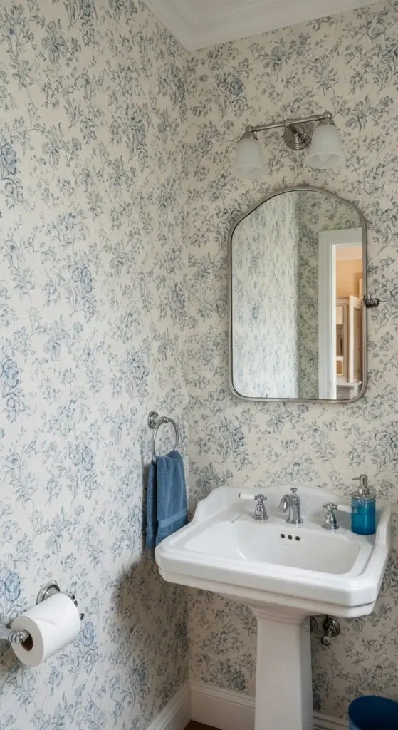 Choose designs featuring delicate roses, peonies, or wildflowers against cream or soft white backgrounds. These patterns work beautifully on accent walls behind pedestal sinks or across entire rooms when you’re feeling bold. The key lies in selecting wallpapers with subtle color variations that won’t compete with your fixtures while maintaining that coveted cottage aesthetic.