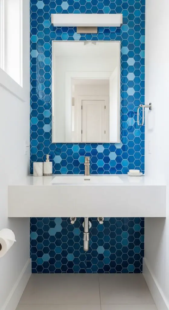The soft blue tones naturally reflect light, helping your half bathroom achieve that bright and airy quality that makes even compact spaces feel more open and welcoming.