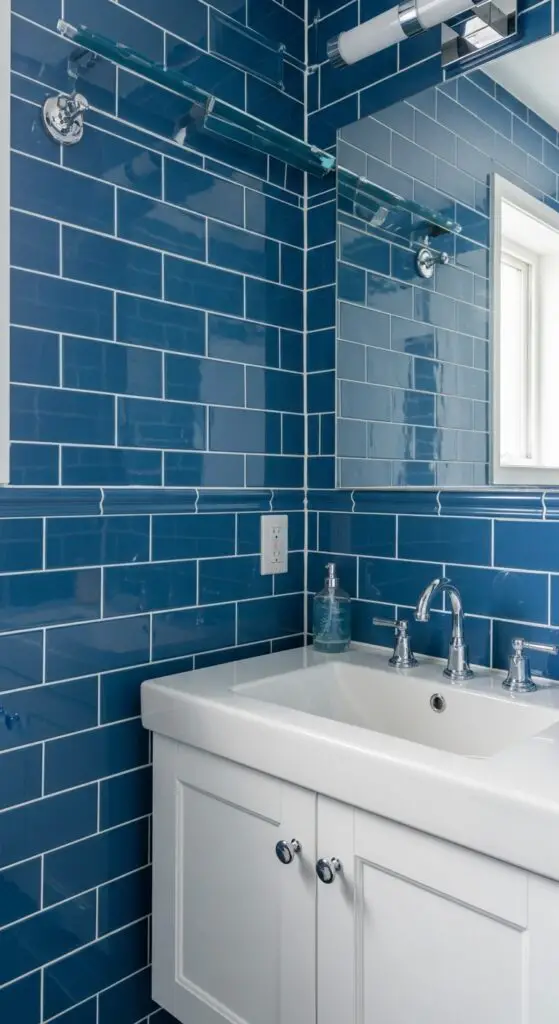 The sleek blue tile accents paired with crisp white grout provide perfect contrast that brightens your space. Choose from navy, powder blue, or cobalt shades to match your personal aesthetic and existing fixtures.