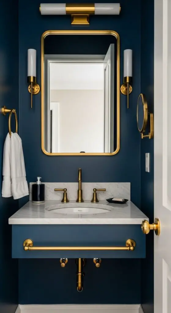 Install exquisite gold hardware like brushed brass faucets, cabinet pulls, and towel bars against deep blue cabinetry or walls. Add striking marble countertops with subtle gold veining to enhance the luxurious feel.