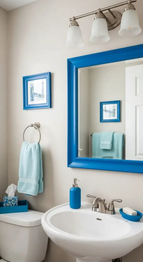 Strategic cerulean blue accessories alter your half bathroom into a lively space without overpowering the room’s compact dimensions.