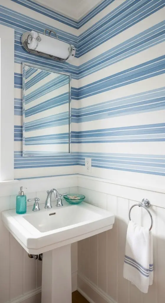 Blue and white striped patterns bring timeless nautical charm to your half bathroom while creating the illusion of expanded space through their rhythmic visual flow. You’ll find these classic designs work beautifully on wallpaper, shower curtains, or towels without overwhelming your compact space.
