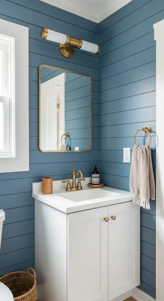 Alter your half bathroom into a cozy modern farmhouse haven by installing denim blue shiplap that brings warmth and character to your space. The rich blue tone creates a sophisticated backdrop that pairs beautifully with white trim and brass fixtures.