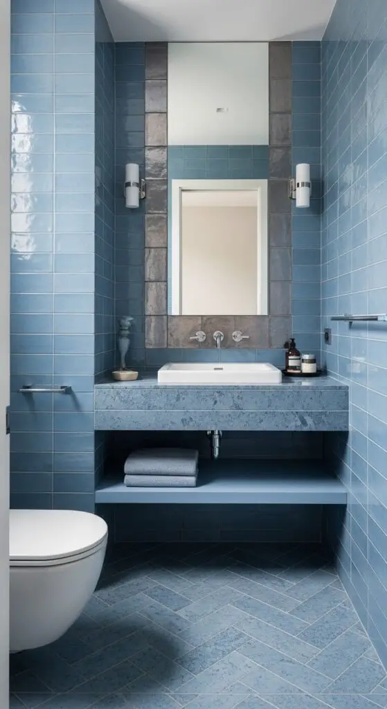 Start with textured blue stone flooring as your foundation, then layer medium-toned subway tiles on walls. Add metallic blue accent tiles strategically around mirrors or as border strips to create subtle contrast without breaking the monochromatic flow. This approach eliminates visual breaks that make small spaces feel cramped, instead creating an uninterrupted canvas that makes your half bathroom appear larger and more serene. Consider incorporating different tile patterns like herringbone or chevron on the floor to add visual interest while maintaining the monochromatic scheme.