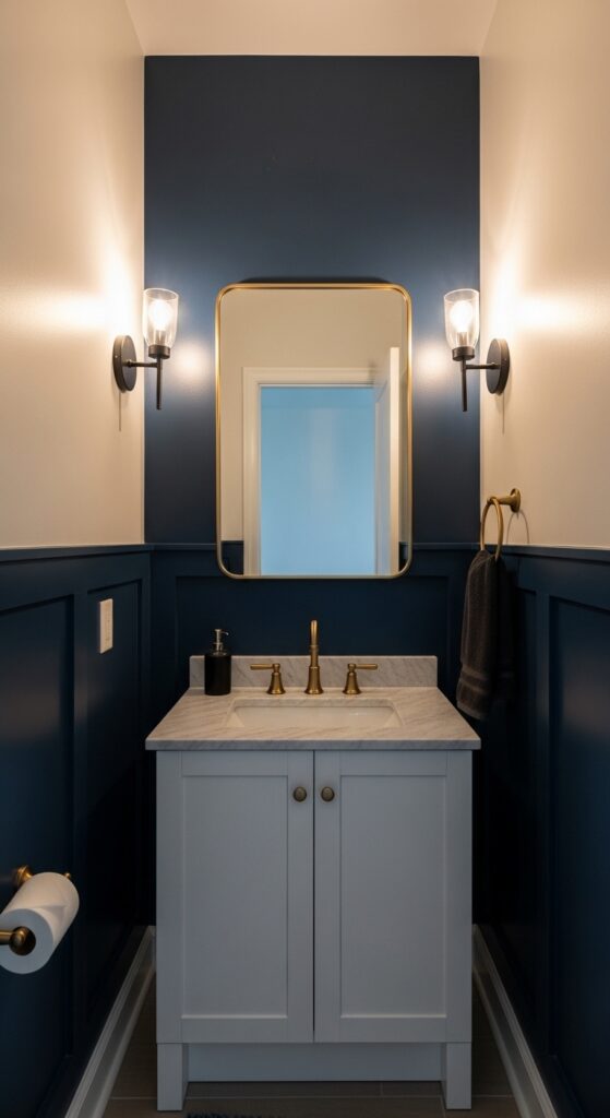 When you want to make a bold statement in your half bathroom, navy blue accent walls deliver striking visual impact that alters even the smallest space into a sophisticated sanctuary. Deep navy feature walls behind your vanity create instant focal points while maintaining an open, airy feel.