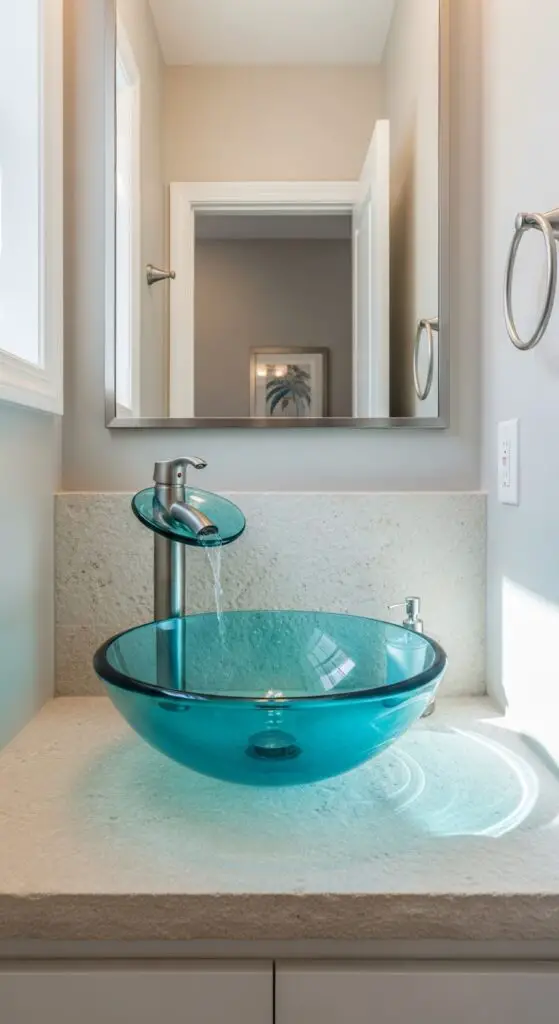 Striking glass vessel sinks alter your half bathroom into a sophisticated coastal sanctuary that enraptures guests from the moment they enter. These opulent glass bowls create dramatic focal points while reflecting light throughout your compact space.