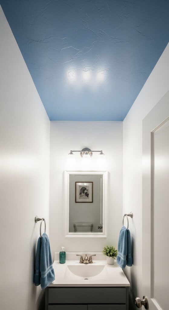 Moving from wall treatments to overhead design elements, periwinkle blue ceilings create an unexpected focal point that makes your half bathroom feel dramatically larger and more inviting. You’ll break away from traditional white overhead treatments while maintaining an airy, open atmosphere that defies cramped quarters.