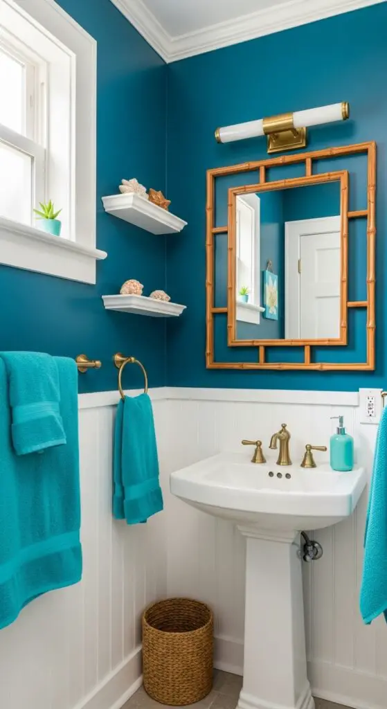 Reinvent your half bathroom into a rejuvenating tropical oasis by incorporating lively teal and turquoise accents that immediately whisk you away to crystal-clear Caribbean waters.