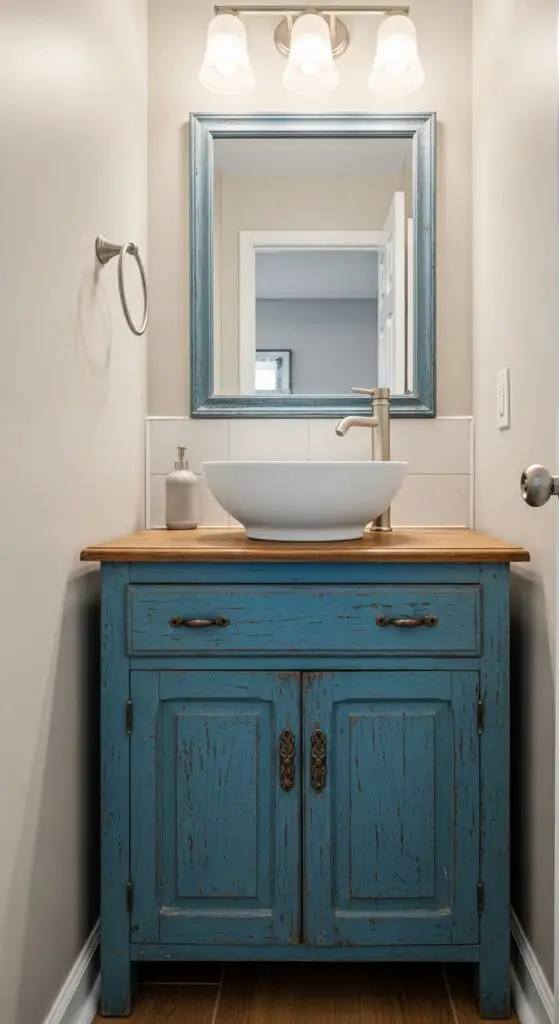 Distressed blue vanities work beautifully when you’re seeking character without overwhelming your compact space. Look for pieces with chipped paint, worn edges, or naturally aged wood that showcase authentic vintage appeal.