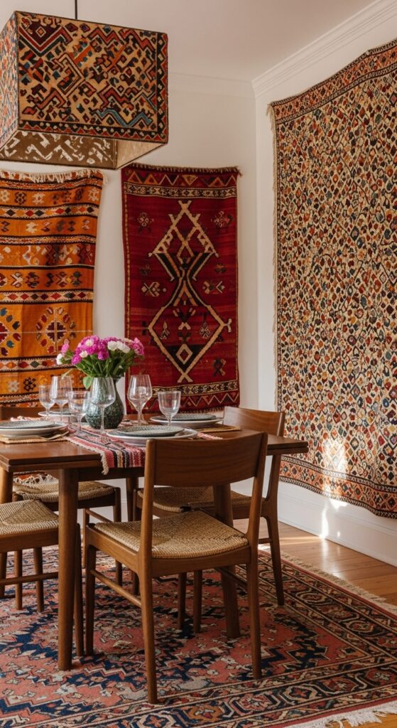 Hang a vibrant Moroccan kilim above your dining table or drape an Indian block-print textile across an accent wall. You’ll create visual interest while celebrating diverse craftsmanship. Position these pieces strategically to draw the eye upward and make your ceiling appear higher.