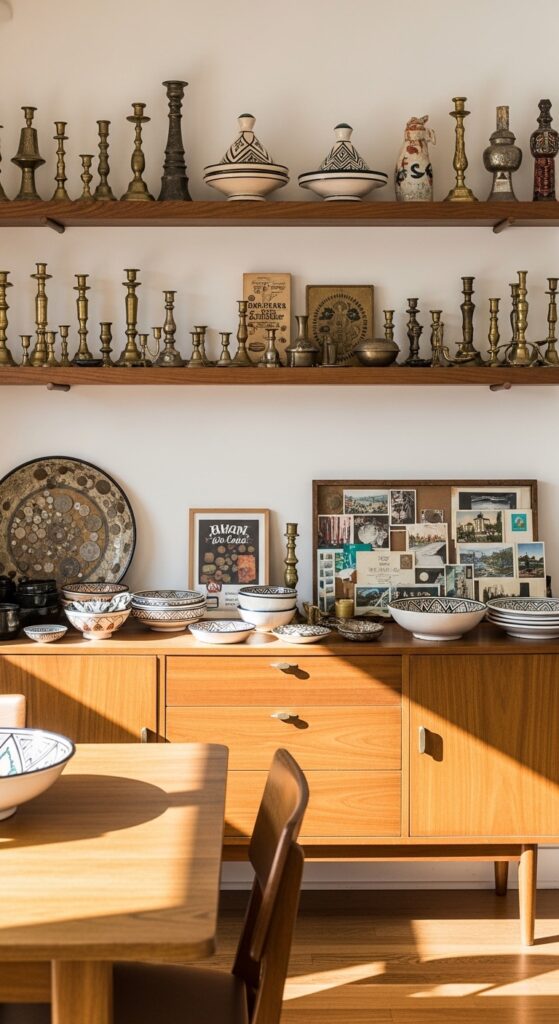 Beyond wall decorations, your dining room becomes a personal museum when you showcase meaningful collections of vintage finds and travel treasures throughout the space. Create vignettes on floating shelves, sideboards, or vintage cabinets to showcase collected trinkets that tell your story. Group ceramic bowls from Morocco alongside brass candlesticks from India, or arrange vintage postcards with antique coins you’ve unearthed at flea markets.